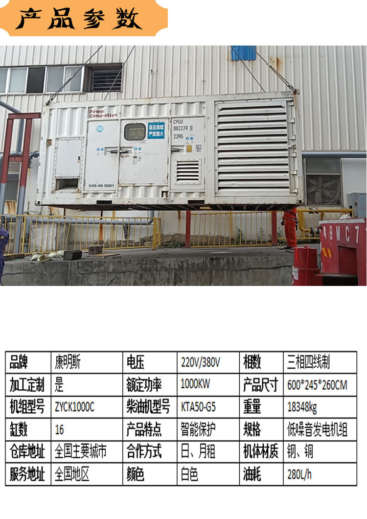 公司為客戶供應(yīng)有多種型號的康明斯發(fā)電機(jī)組,可以根據(jù)客戶自身用電需求使用相應(yīng)功率的發(fā)電機(jī)組供電。公司提供的功率小到50KW,大到1600KW的功率均有供應(yīng)。在這我公司就簡單的用1000KW的康明斯發(fā)電機(jī)組為例,簡單介紹一下相關(guān)參數(shù)。